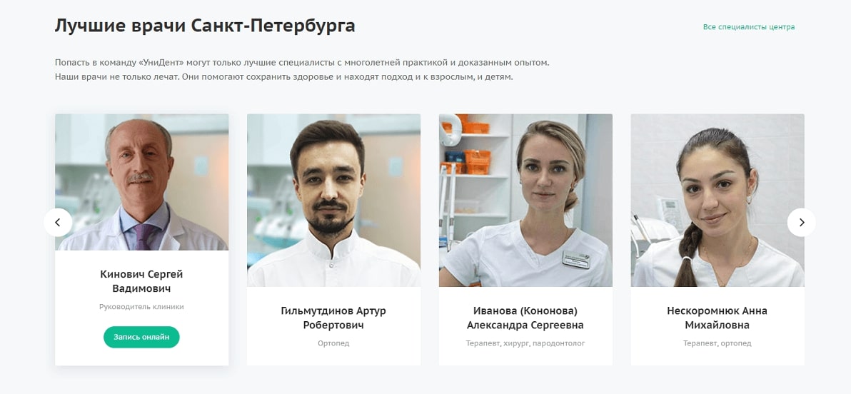 Команду квалифицированных враче клиенты должны знать в лицо. Подробное описание квалификации каждого специалиста с возможностью