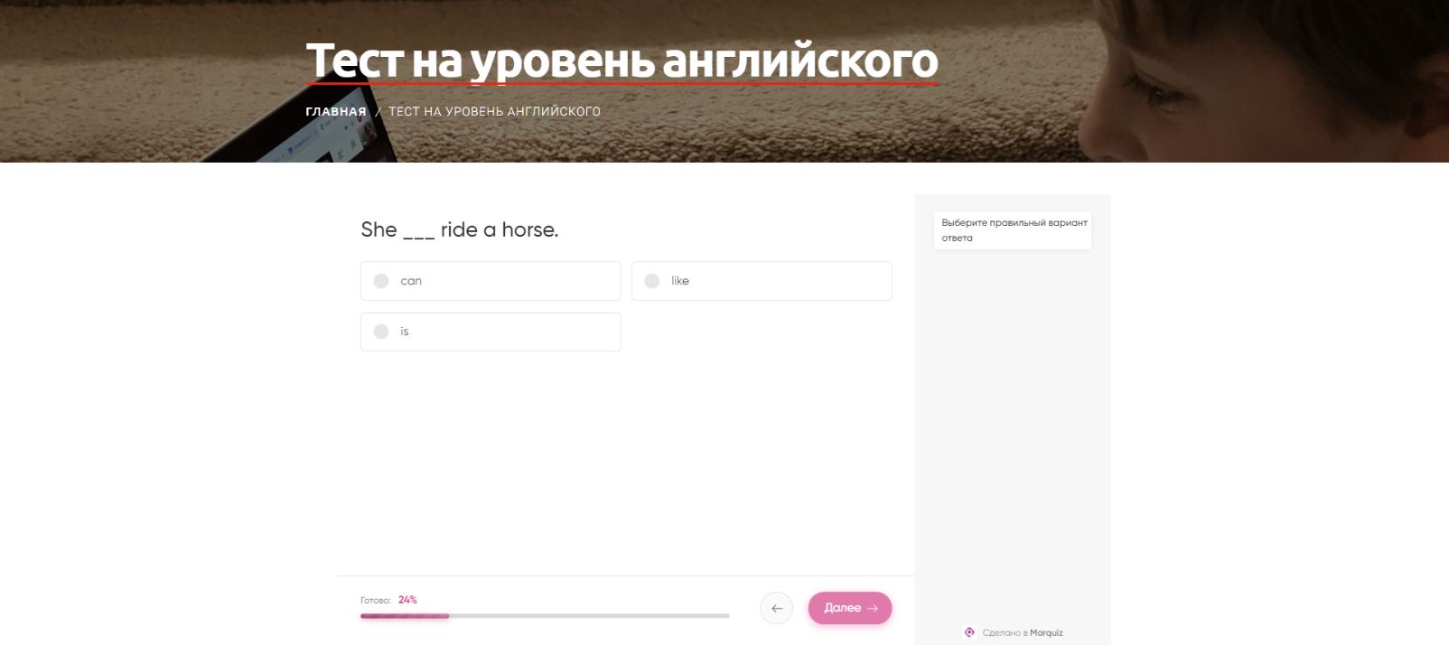 Интегрировали на разработанный сайт квиз, который дает возможность пользователю проверить навыки английского языка, а так же предложить оптимальный тариф для обучения на основе поученных баллов.