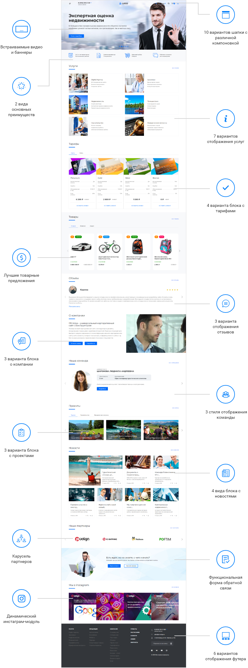 - Варианты отображения преимуществ, акций, проектов, новостей, блога, сотрудников, отзывов, сертификатов, контактов и т.д.