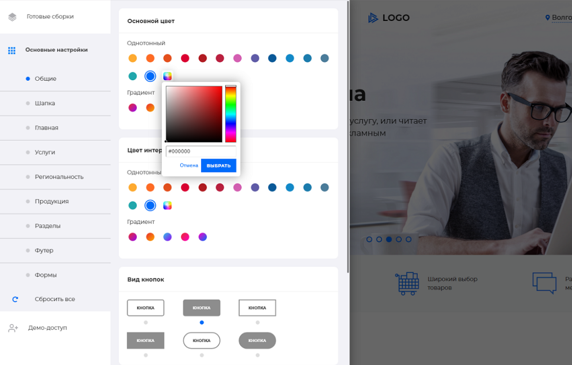 - 14 готовых цветовых схем + готовые градиентные цвета + возможность задать свой собственный цвет для основных элементов сайта и отдельно для интерактивных (кнопки, ссылки и т.д.);